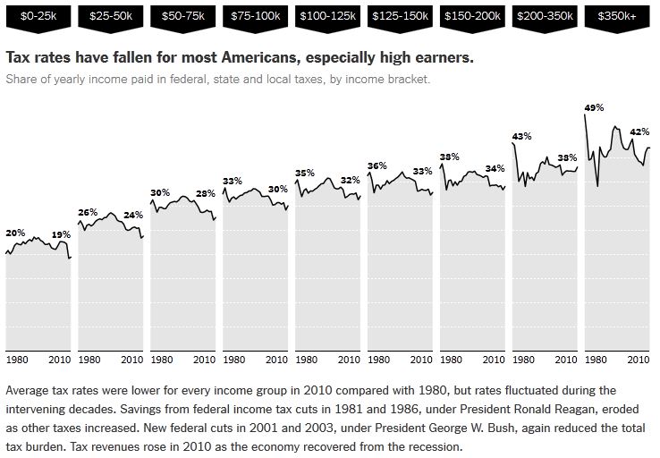 The New York Times has published an analysis that concludes that tax rates have gone down for almost everyone in the U.S. since 1990:
